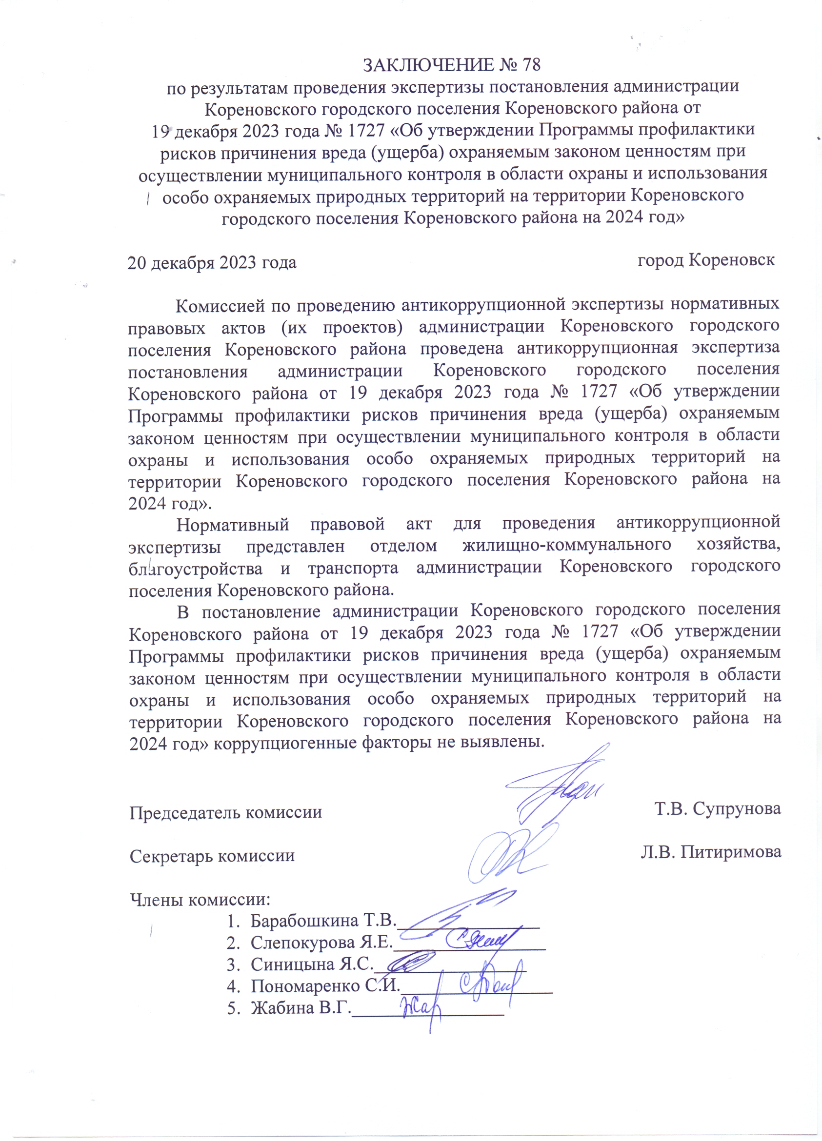 ЗаключениеОб утверждении Программы профилактики рисков причинения вреда (ущерба) охраняемым законом ценностям при осуществлении муниципального контроля в области охраны и использования особо охраняемых природных территорий на территории Кореновского городского поселения Кореновского района на 2024 год