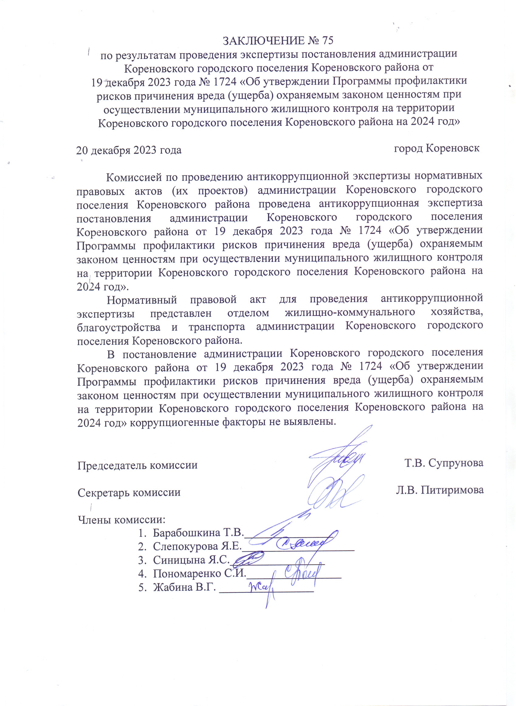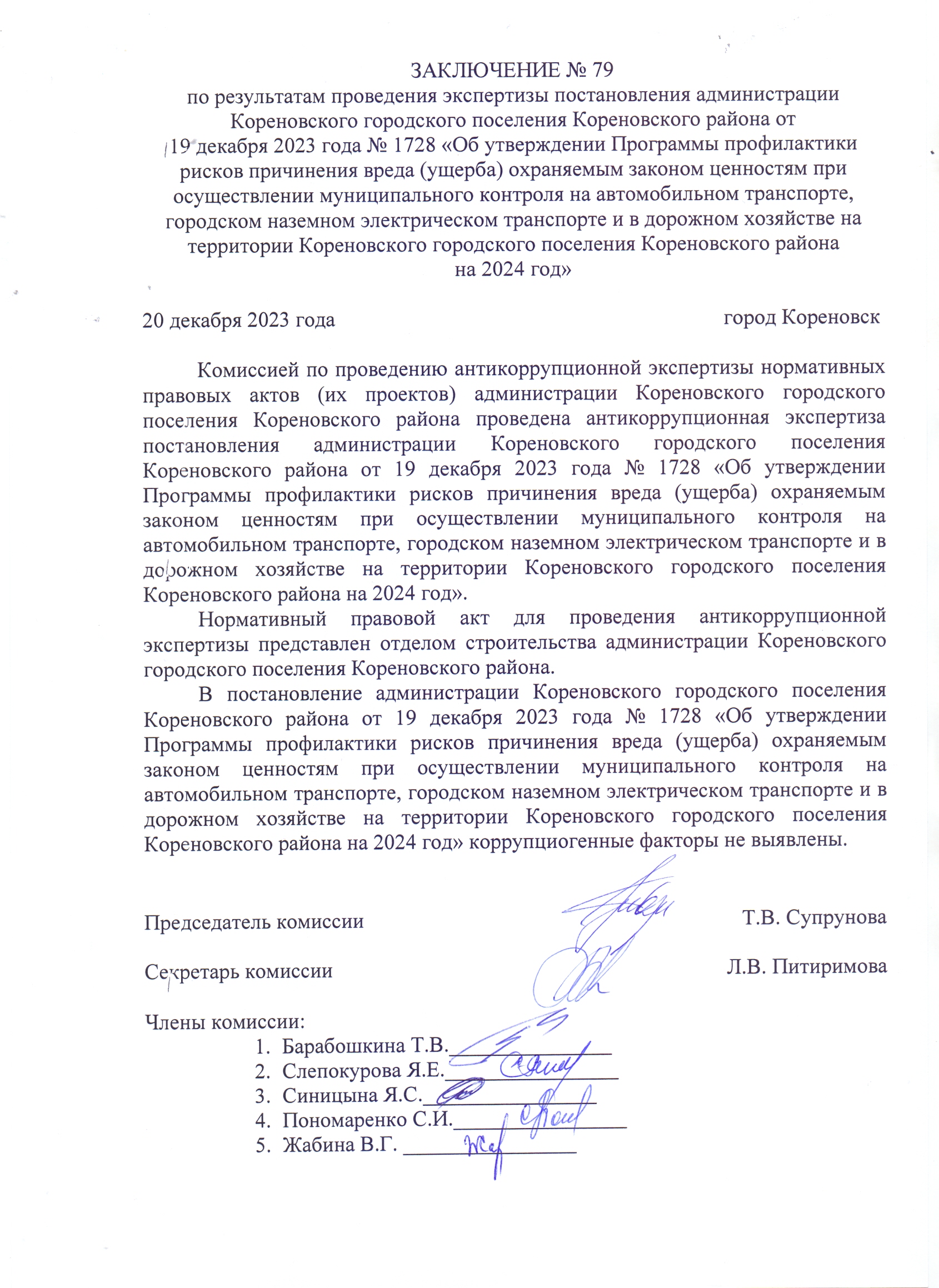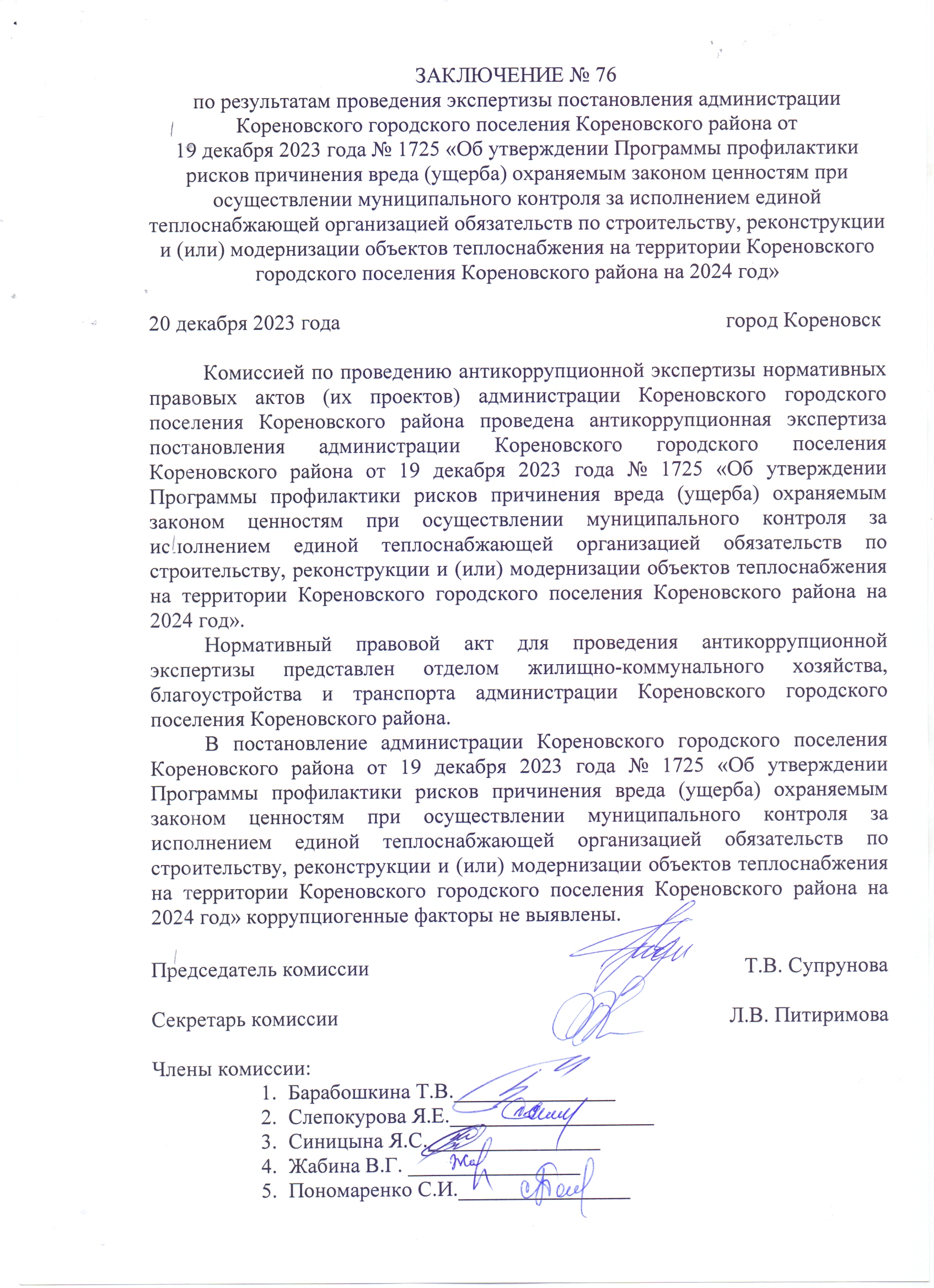 ЗаключениеОб утверждении Программы профилактики рисков причинения вреда (ущерба) охраняемым законом ценностям при осуществлении муниципального контроля за исполнением единой теплоснабжающей организацией обязательств по строительству, реконструкции и (или) модернизации объектов теплоснабжения на территории Кореновского городского поселения Кореновского района на 2024 год