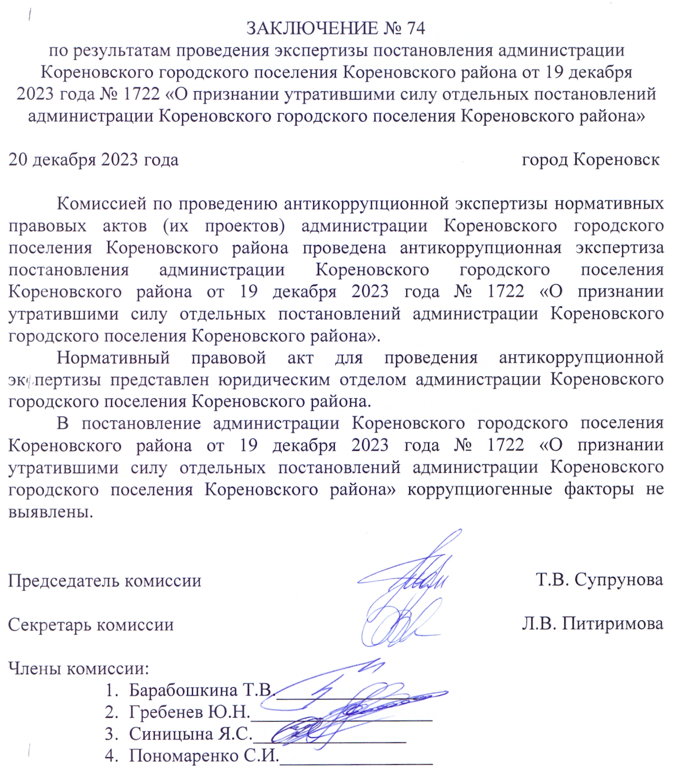 ЗаключениеО признании утратившими силу отдельных постановлений администрации Кореновского городского поселения Кореновского района