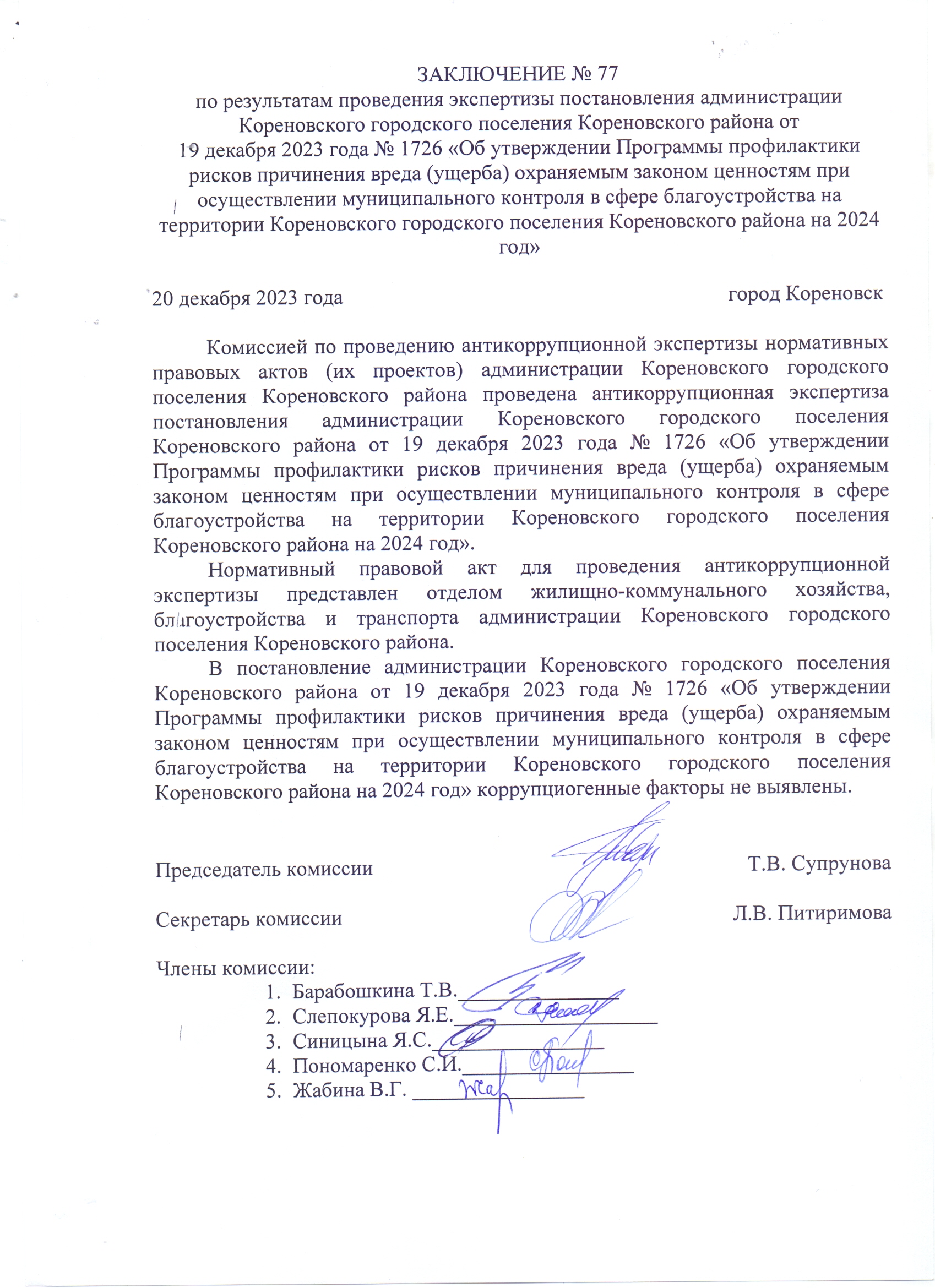 ЗаключениеОб утверждении Программы профилактики рисков причинения вреда (ущерба) охраняемым законом ценностям при осуществлении муниципального контроля в сфере благоустройства на территории Кореновского городского поселения Кореновского района на 2024 год